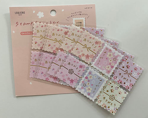 “切手しーる“は切手風デザインのシールで”ありがとう”はチューリプ・マーガレットの2バージョンあり、他には”ほんのきもち、こころばかり”も2柄づつ入っています。