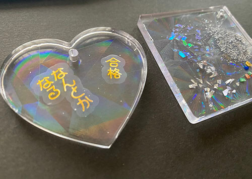 レジンに入れられる封入るシール・パーツなどを組み合わせてオリジナルキーホルダーを作る事ができます、上にあったひらがな・カタカナモールドで作った文字を使えばオリジナルネームプレートも作れます。