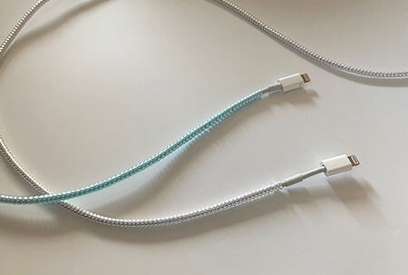 画像だと分かりにくいかも知れませんが、カバーの色は白ではなくオーロラカラーなので光の反射で色が変化して見えます、ただの白だと実用的に見えそうですがキラキラとしたラメも入っているので華やかな遊び心があるケーブル感がでます