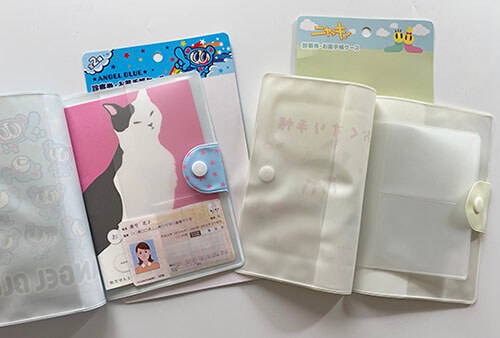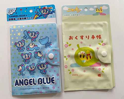 セリア お薬手帳ケース「ANGEL BLUE診察券・お薬手帳ケース」「ニャッキ!診察券・お薬手帳ケース」(各110円)