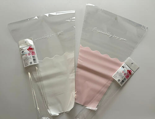 セリア ブーケスリーブスリーブは上部は透明で下部は色付きになっていて、上が広く下にいくほど狭くなっている袋です