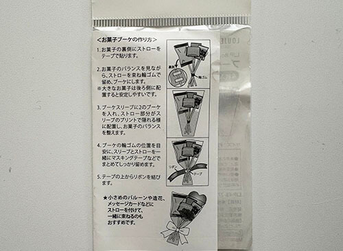 セリア ブーケスリーブ“ブーケスリーブ”を使ったお菓子ブーケの作り方はパッケージの裏側に記載されているのでこれを見ながら真似するだけで完成します