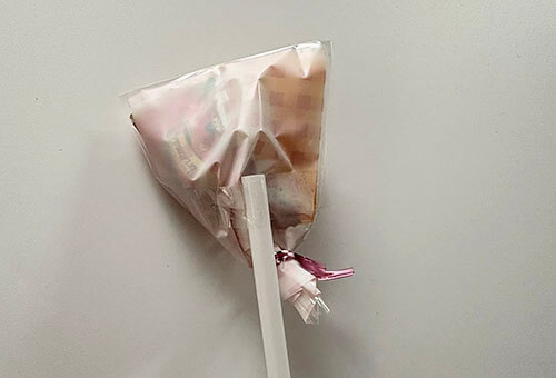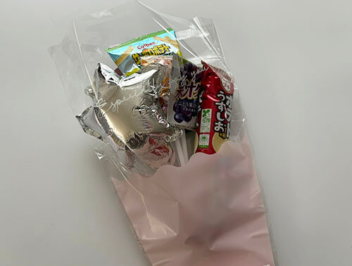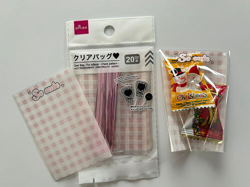 飴などの小さい物は小さなラッピング袋に入れから使います、画像の物はダイソーで買ったロリポップ用のラッピング袋です、袋とタイが20セット入って110円です