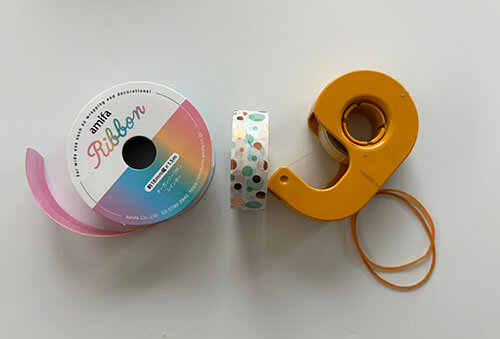 セリア ブーケスリーブお菓子ブーケを作るのに必要な道具は”リボン、マスキングテープ・セロハンテープ、輪ゴム”、画像にはないですがリボンを切る時にハサミを使用します
