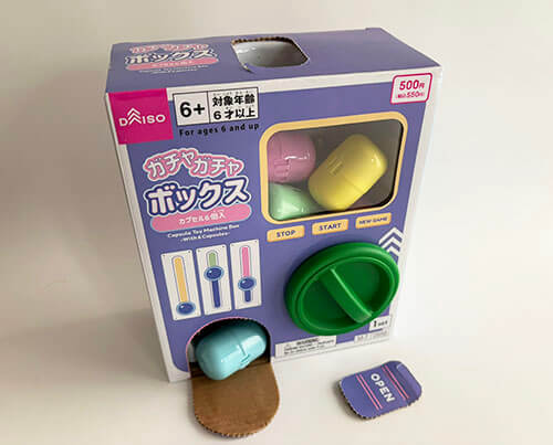 組み立て済みの箱に専用のカプセルが6個入って550円です、購入後にやる作業はカプセルが通るようにOPENと書かれた場所の切り取り線を剥がすところのみです、購入後30秒程度で遊べます