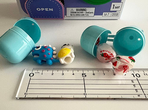 ダイソー ガチャガチャボックスカプセルの中には消しゴムがすでにセットされています、消しゴムを全部出した後は空のカプセルにお菓子や小さなオモチャなどを入れてくり返し遊ぶ事ができます