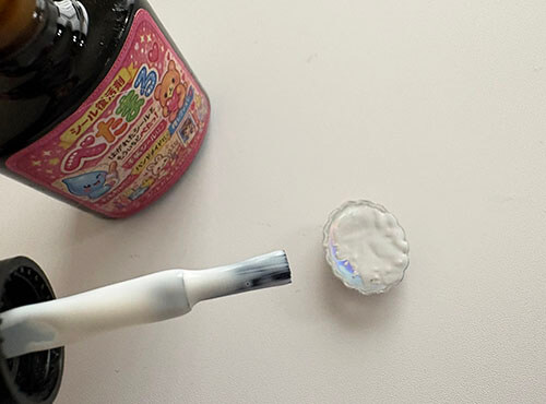シール復活剤 ぺたまるこちらはマニキュアのように中に小さな刷毛が入っているのでそれを使用してシールにしたい物の裏に液をつけます