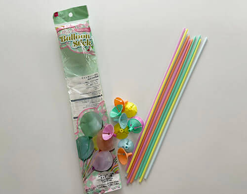 スティックがついていないアルミバルーン、マスコットなどをバルーンブーケに入れたい場合、他の物と長さを合わせる為にスティックが必要ですがストローではちょっと長さが足りない、曲がってしまう..という時などにはバルーンスティック単品がダイソーで販売されているのでこちらを使うのも手です