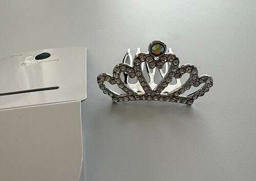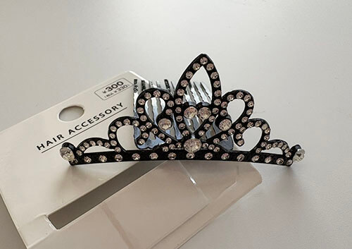 購入した店舗では”ヘアアクセサリーコーナー”で販売されていました、王冠のデザインでコームがついているので髪の毛にさしこんで使えます